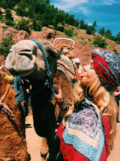 After our tea time, we jumped back on the bus and rode further into the hills to where our camels were waiting for us!!!! THE COOLEST EXPERIENCE EVER! We were told to bring scarves with us, and the camel man tied them around our heads for us. While its not necessary for tourists or foreigners to wear a headscarf in Morocco, it is respectful to the locals and they do appreciate it (like I mentioned, they love sharing their culture and lifestyle with people who are visiting. Not cultural misaproporation whatsoever). We rode the camels single file through the hills for about 30 minutes before heading back to our bus. Camels are incredibly uncomfortable to sit on, if you think horses are bad, these are even worse. There were some baby camels too who tagged along with their mamas and rode alongside of us. Similar to the way that dogs have personalities, the camels did too. It was hysterical watching them interact with us and each other.